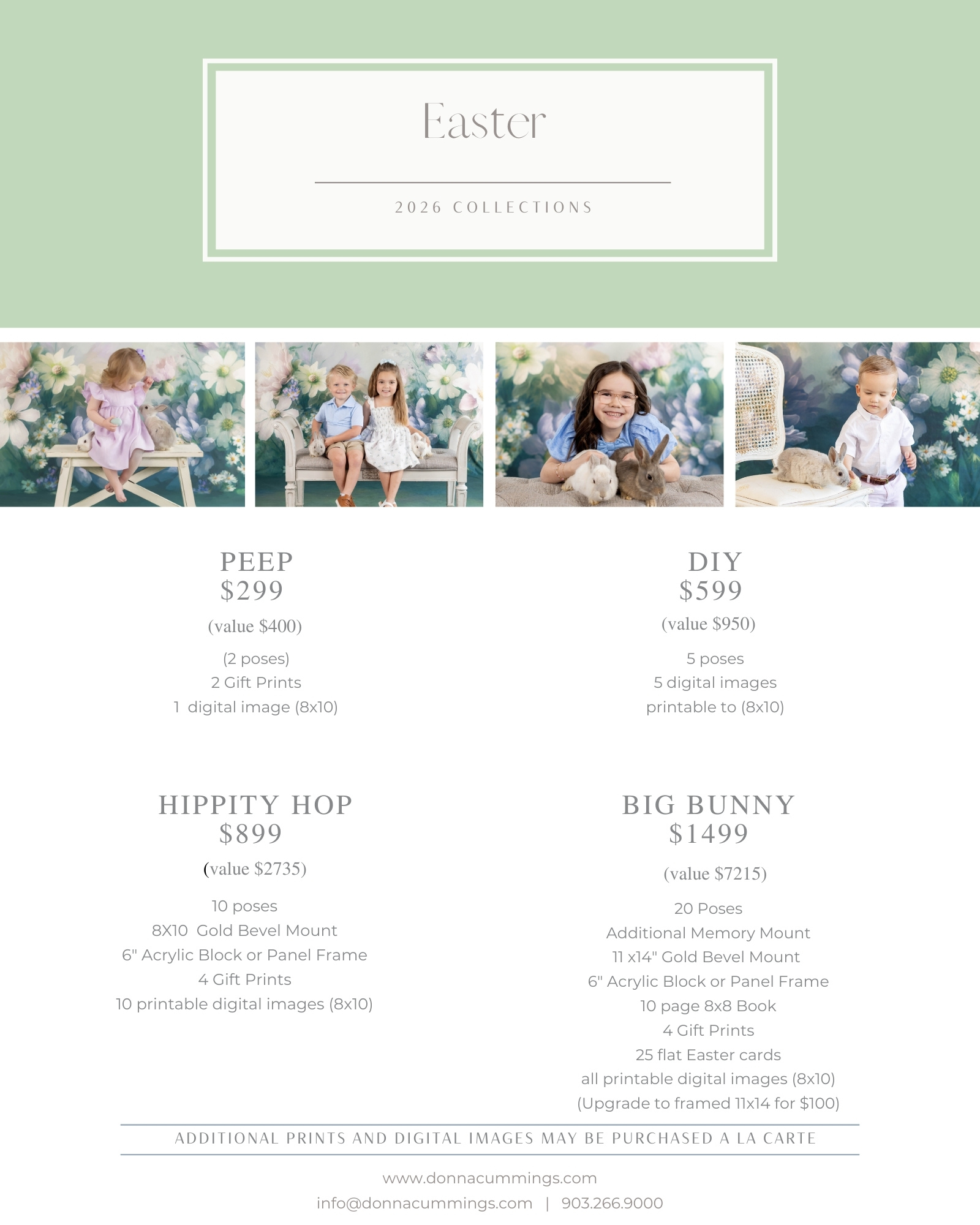 Our Easter mini special includes a 30 minute session with live bunnies and Easter eggs. Our non-refundable retainer of $350 includes your session fee, an 8" gold beveled memory mount, plus a $200 credit to be used at your purchasing appointment. This mini session is designed for one immediate family group. Our Easter set is created for children sitting up to 14 years of age. Your $200 credit will be applied to any additional print and/or digital product packages that you purchase.