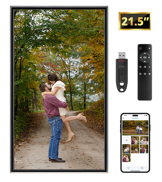 A stunning modern way to display all your favorite photos on your wall or table. Enjoy built-in photo space on this large Digital Frame or view from a USB. It also works from your phone.